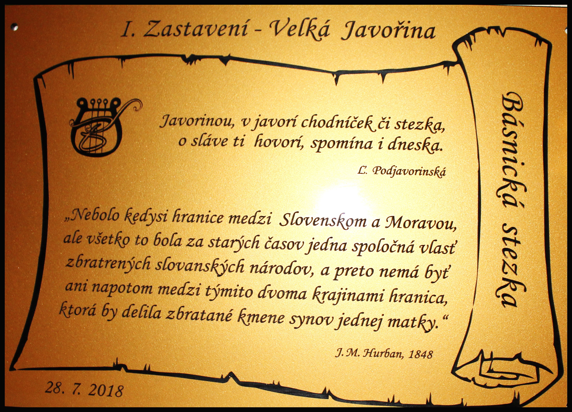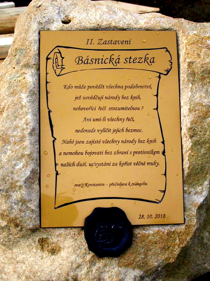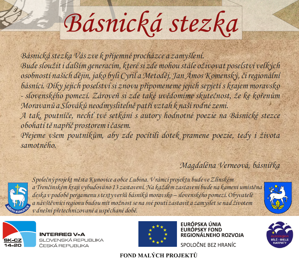 republiky. Odsud se pak odvíjí další zastavení směrem na Moravu i na Slovensko ve stejném pořadí. Takže od ústředního I. Zastavení směřuje II.-V. zastavení dále Slovenskými Karpatami a II.-V. zastavení je u nás na Moravě. Nutno podotknout, že naše jednání a spolupráce se slovenskými aktéry stezky probíhalo vždy se vstřícností, aktivitou a vzájemným pochopením. A v tomto duchu budeme odkaz Básnické stezky rozvíjet i nadále. Panu starostovi obce Lubina Ing. Martinu Benatinskému také vděčíme za poskytnutí kamenů na všech devět zastavení Básnické stezky.