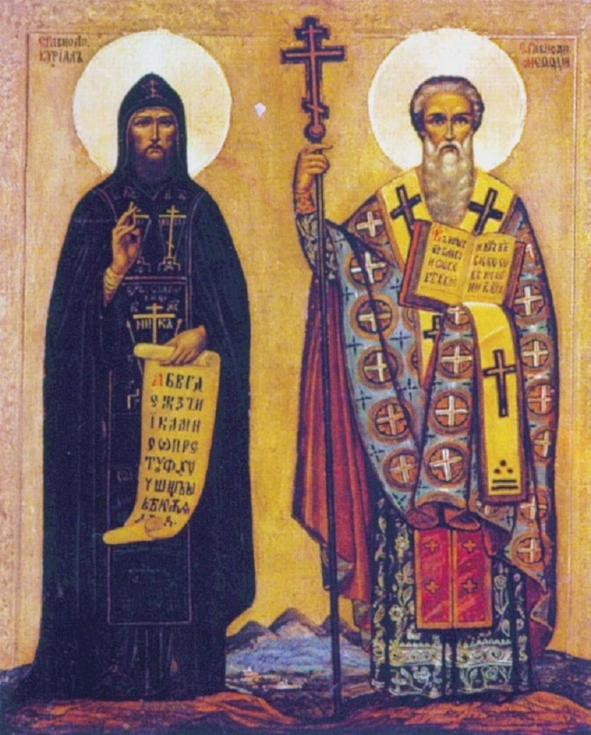 Svatí Konstantin a Metoděj (označováni někdy jako Soluňští bratři, apoštolové Slovanů či slovanští věrozvěstové) - bratři ze Soluně, v rámci své misie na Velké Moravě prosadili staroslověnštinu jako bohoslužebný jazyk, pro který Konstantin vytvořil také písmo nazývané hlaholice. Papež Lev XIII. je v roce 1880 svatořečil a v roce 1981 je Jan Pavel II. prohlásil spolupatrony Evropy. Jsou také hlavními patrony Moravy. U nás slavíme svátek Cyrila a Metoděje 5. července. Jejich odkaz pro tehdejší Velkou Moravu ale i Moravu dnešní spočívá v propojení východní a západní liturgie, ale také kultury. Kulturně historicky totiž tvoří řeka Morava faktickou hranici mezi východem a západem. Můžeme tedy užívat pozitiva i negativa západního světa, ale zároveň zde již pociťujeme také silný vliv východní kultury. A také v tomto je náš kraj jedinečný, čehož si věrozvěstové Konstantin a Metoděj při svém působení byli vědomi. Připomeňme si také, že pravděpodobné místo posledního odpočinku sv. Metoděje je nedaleko od tohoto zastavení. Může se jednat o archeologické naleziště Špitálky, nebo kostel v Sadech.